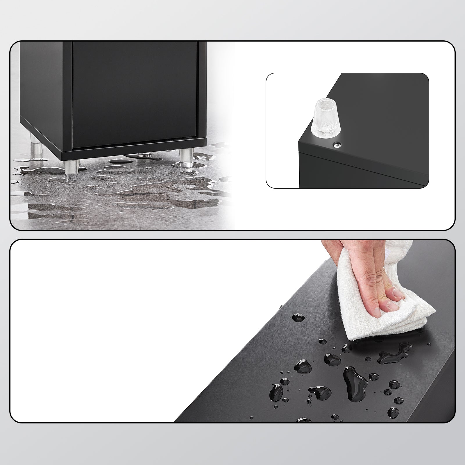 .L'armoire est fabriquée en E1-MDF de haute qualité et bénéficie d'une finition laquée lisse. Combinée aux pieds hydrofuges, cette armoire est très résistante à l'humidité, ce qui la rend particulièrement adaptée à une utilisation dans la salle de bains. Même en cas d'utilisation quotidienne, l'armoire conserve un aspect soigné et stable.