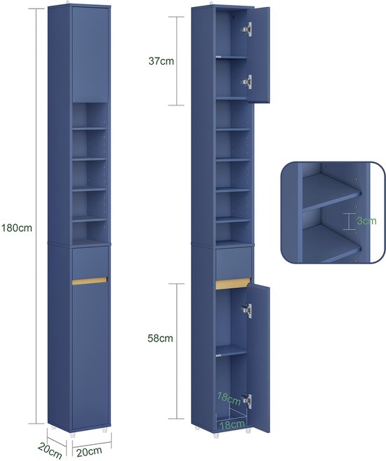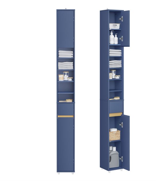 SoBuy Armoires de salle de bain hautes - Armoire de rangement avec étagères réglables et tiroir - Armoire colonne salle de bain - Bleu, 20x20x180cm, BZR34-II-B - pour salle de bain, salon, chambre à coucher