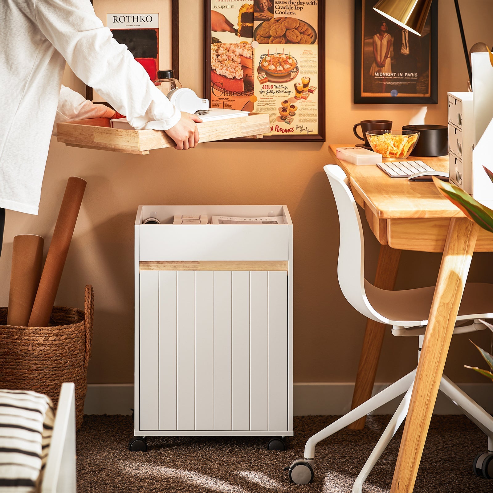 L'étagère supérieure amovible offre un espace pour votre imprimante, vos photos ou des objets décoratifs. Sous l'étagère se trouve un compartiment discret où vous pouvez ranger vos documents importants en toute sécurité.