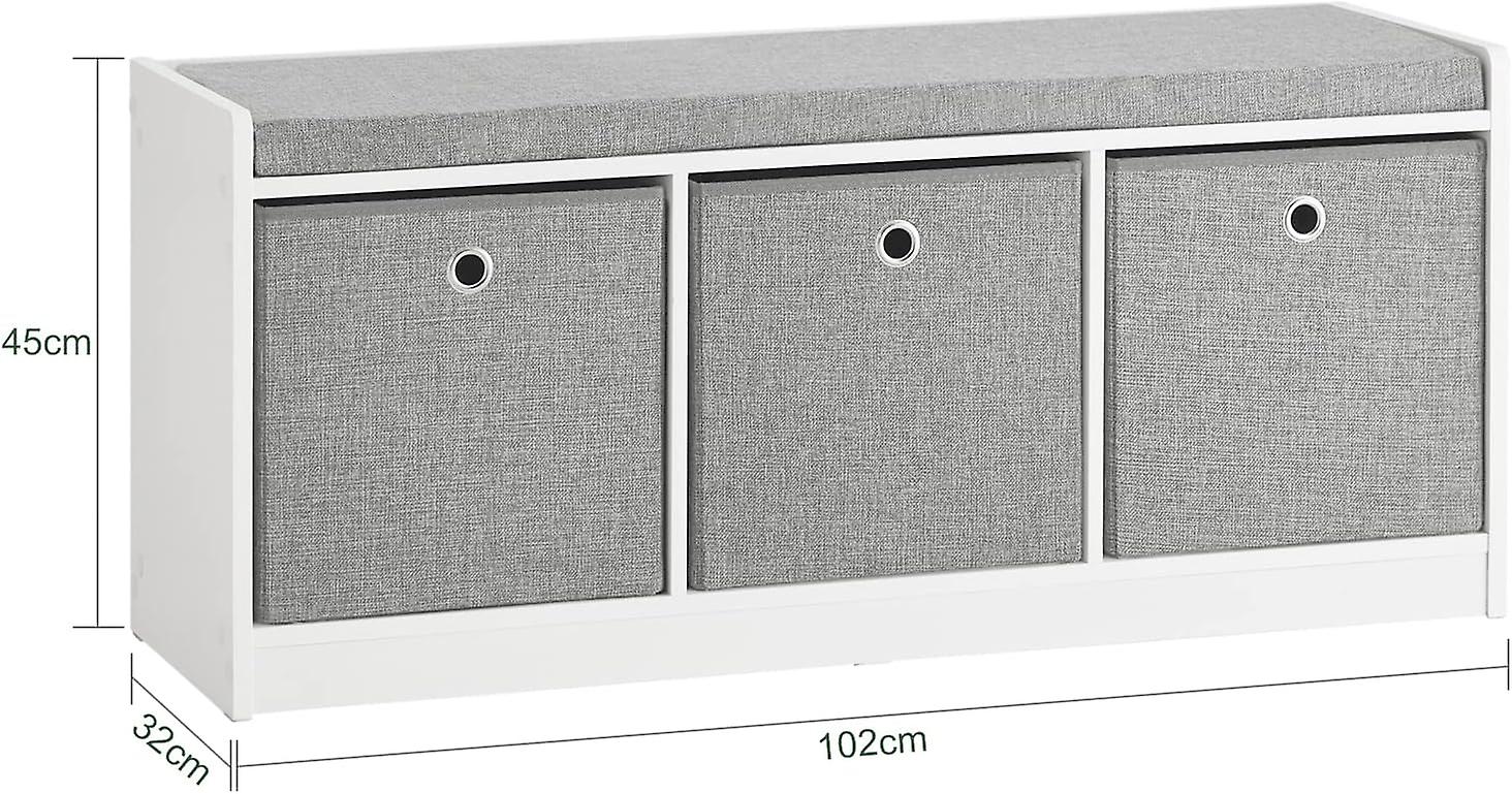 Le banc de rangement moderne pour chaussures est un bon choix pour le couloir, la chambre à coucher, etc. Le siège rembourré amovible est idéal pour s'asseoir confortablement tout en mettant et en enlevant les chaussures. Les 3 paniers offrent un grand espace de rangement pour les chaussures, le linge, les jouets, etc. De plus, ils peuvent être entièrement tirés pour constituer une excellente solution de rangement. D'un design moderne, le meuble de rangement s'adapte parfaitement à votre décor moderne ou traditionnel. Vous pouvez combiner ce banc de rangement avec le porte-manteau mural (FRG282-W) comme un ensemble de couloir. Détails du produit Matériau : MDF, tissu. Dimensions : L102 x P32 x H L102 x P32 x H45cm. Poids : 17kg. Capacité de charge : 150kg.