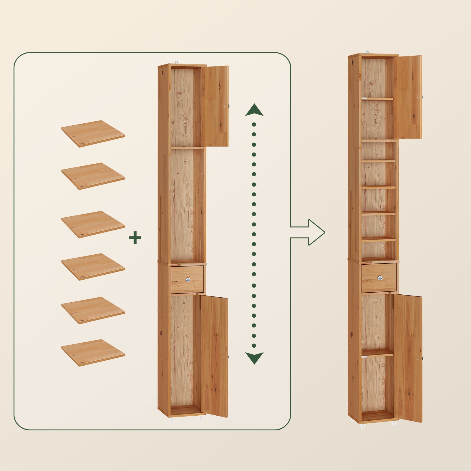 SoBuy BZR34-II-SH Grand meuble de salle de bain étroit - couleur bois - 20 x 20 x 180 cm - autoportant, en bois massif résistant à l'eau, avec étagères et tiroirs réglables