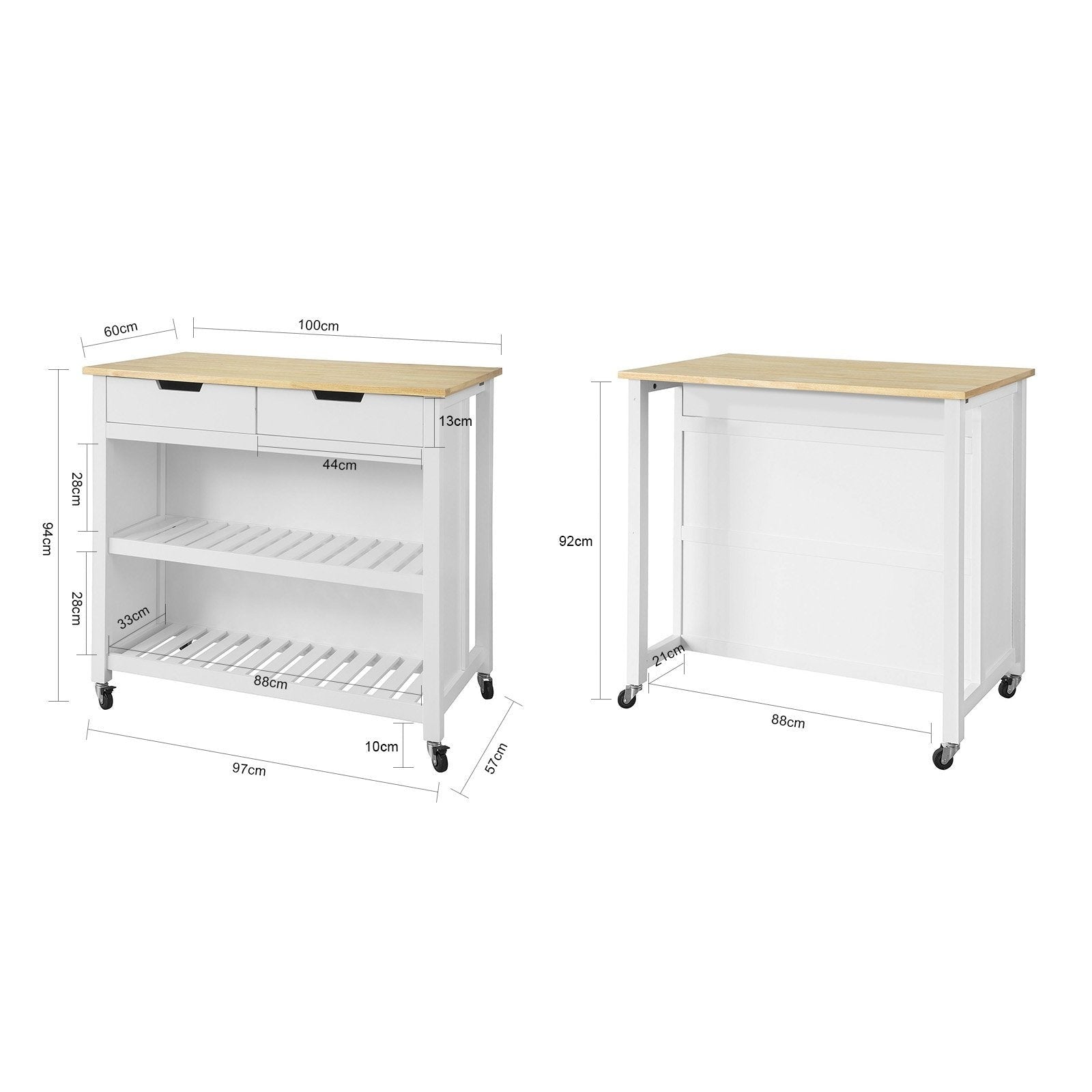 SoBuy FKW74-WN Chariot de cuisine sur roulettes Armoire de rangement - Poids : environ 30,5 kg. - Capacité : jusqu'à 60 kg ; - Matériau : MDF ; - Dimensions du produit : L x H x L environ : 100x94x60 (voir photo) ; - Dimensions de l'emballage : 110x22x67cm. Il dispose de 2 tiroirs et de 2 étagères pour répondre à vos différents besoins de rangement avec beaucoup d'espace. Le plan de travail prolongé à l'arrière offre un espace supplémentaire et marque des points grâce à sa solide capacité de charge. Les 4 roulettes de haute qualité (dont 2 avec frein) vous permettent de placer le meuble de cuisine là où vous en avez besoin.Ce chariot de cuisine de SoBuy est une aide pratique dans votre cuisine pour créer un espace de travail et de stockage supplémentaire. Sur cet îlot de cuisine, un petit déjeuner ou un dîner décontracté avec la famille ou les amis devient une affaire plus agréable. L'îlot de cuisine est un ajout pratique et décoratif à votre cuisine. Il fait bonne figure dans n'importe quelle pièce, quel que soit l'endroit où vous souhaitez l'utiliser. Assemblage : - État de livraison : démonté et emballé de façon pratique. - Instructions de montage faciles à comprendre incluses