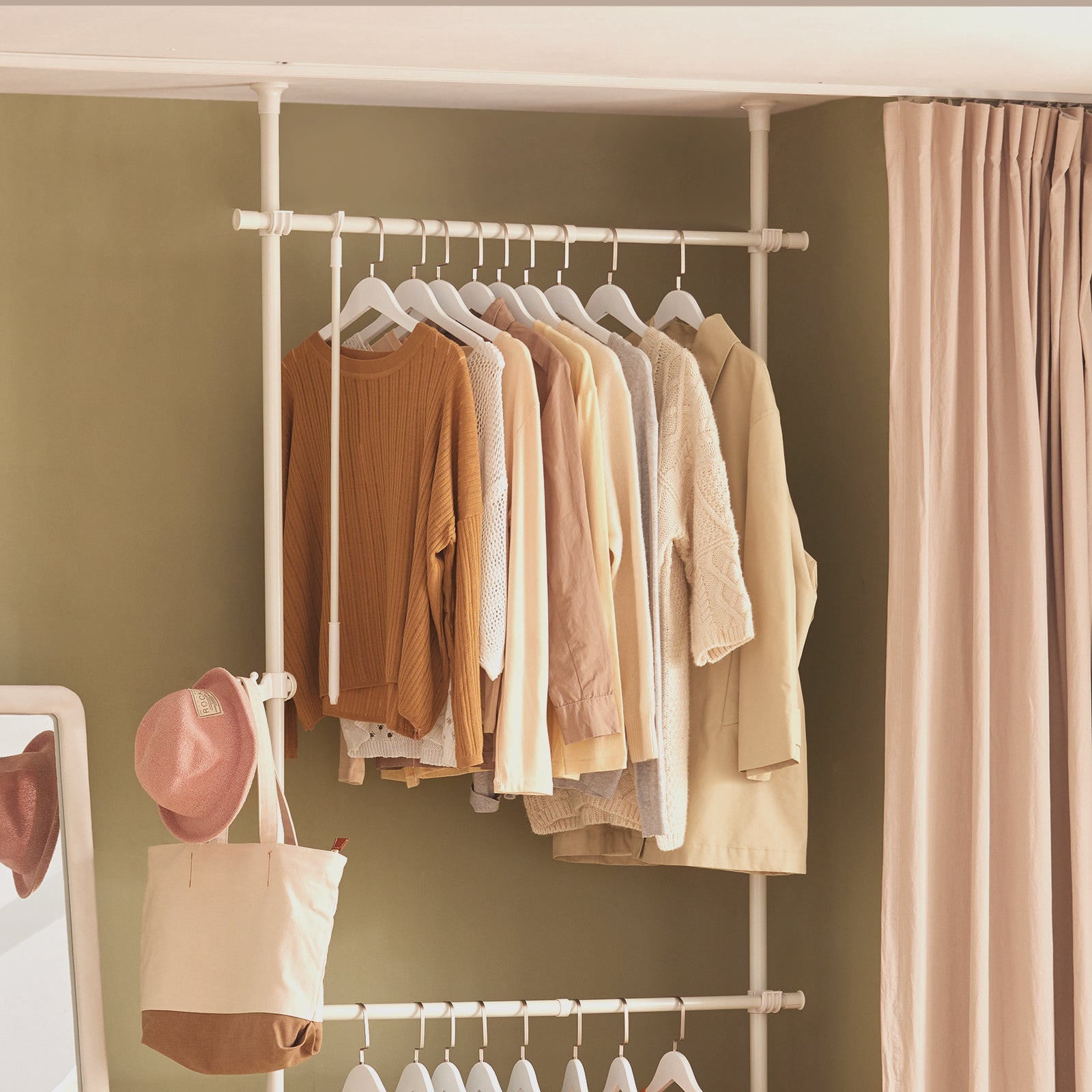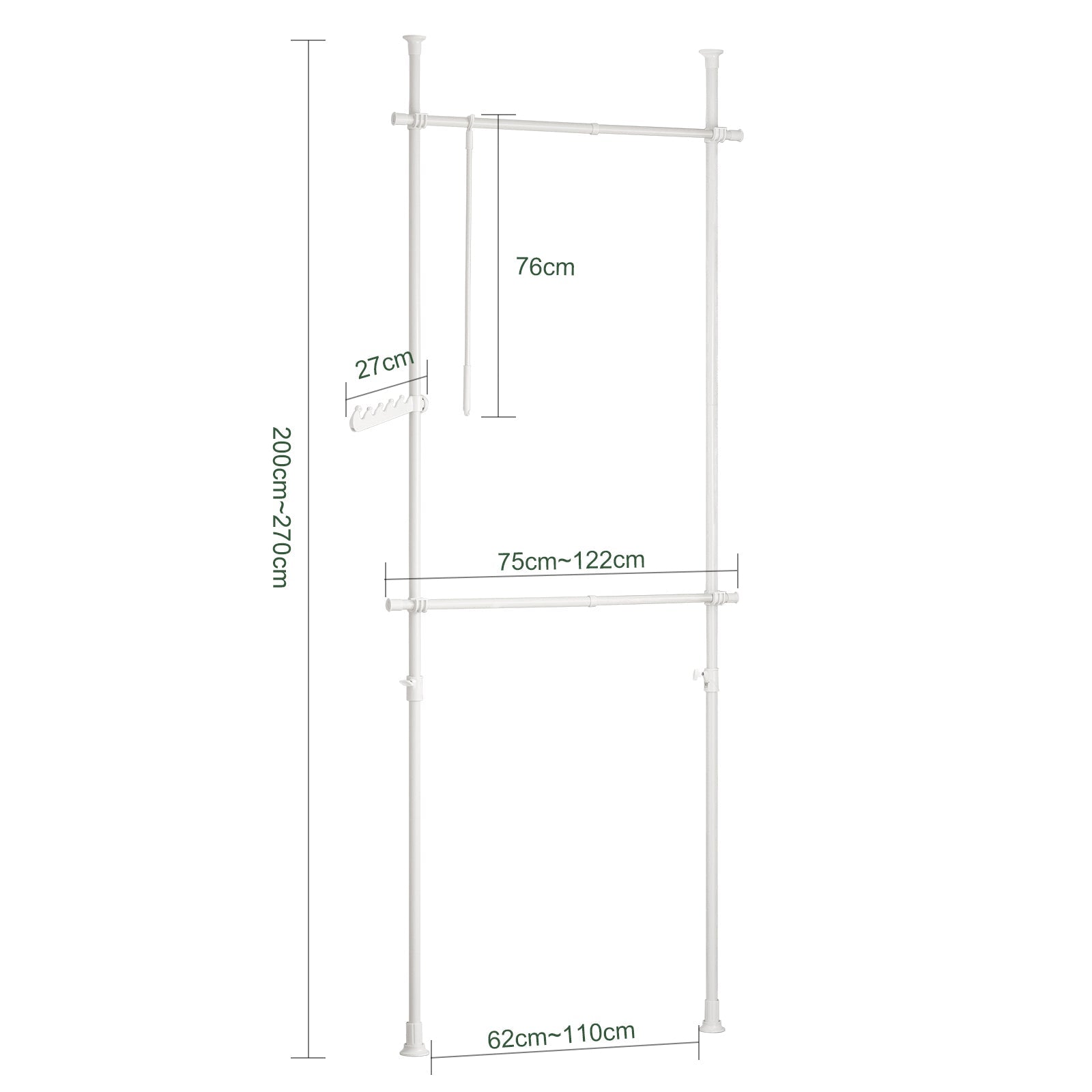 Cet étendoir à vêtements allie stabilité, flexibilité et simplicité. Il est idéal pour ceux qui souhaitent créer un espace de suspension supplémentaire sans montage permanent, ou pour ceux qui souhaitent personnaliser une armoire ouverte et dégagée. Grâce à sa conception extensible, il s'adapte parfaitement à la hauteur et à la largeur de la pièce, tandis que les crochets latéraux s'adaptent à la hauteur de la pièce. Les crochets latéraux offrent des possibilités de rangement supplémentaires.