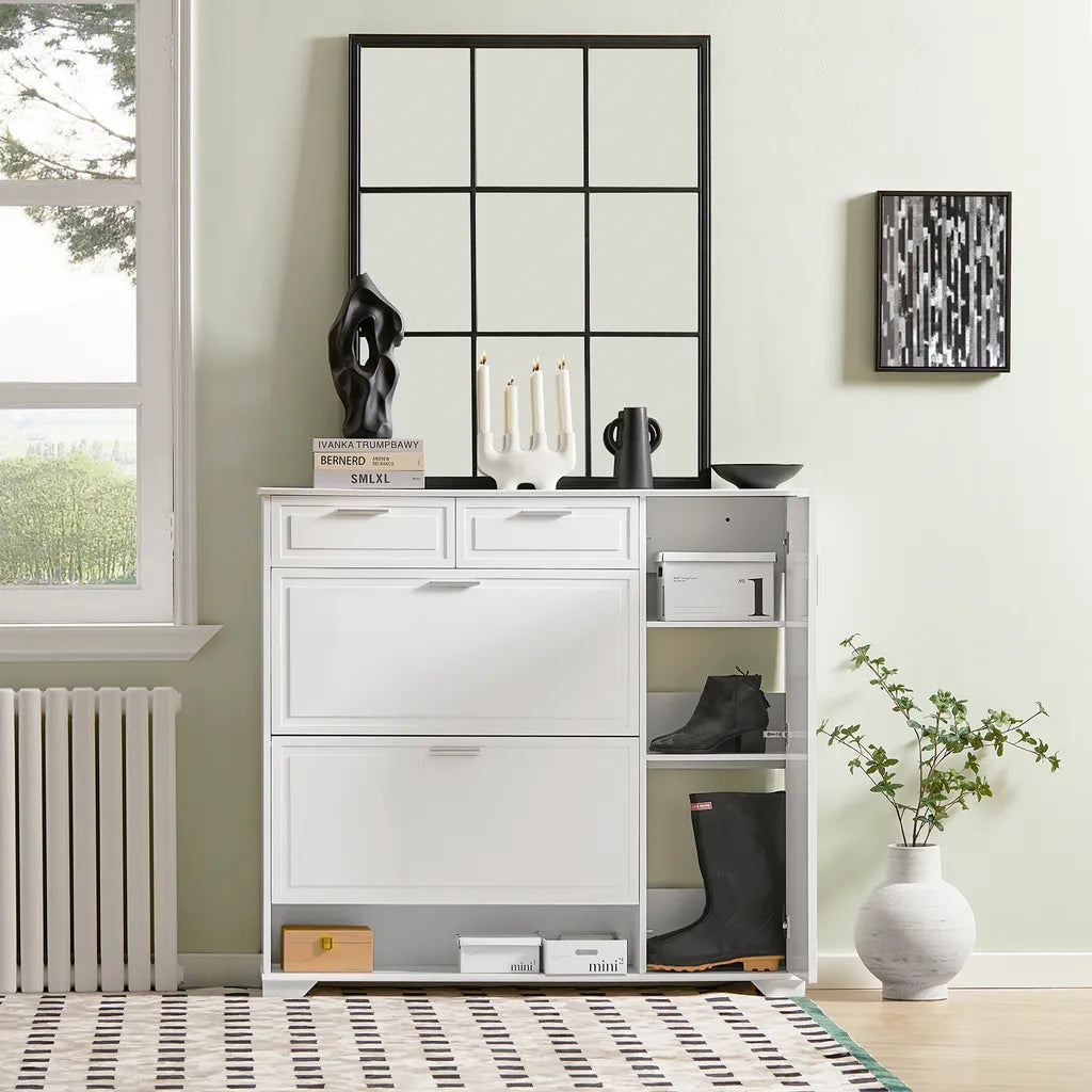 En plus du rangement des chaussures, le support comporte 2 tiroirs et une porte avec tablettes réglables (en 6 niveaux de hauteur). Parfait pour ranger en toute sécurité et commodité les foulards, les chapeaux et autres accessoires. - Compartiment ouvert pour les pantoufles