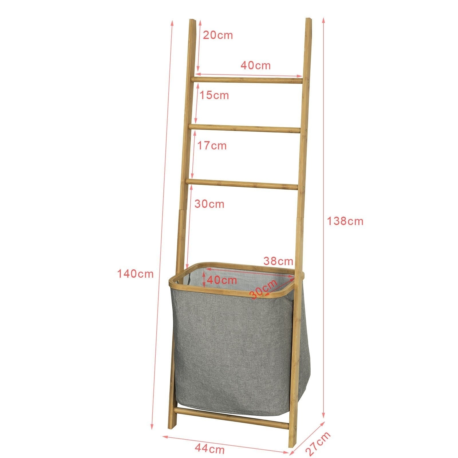 SoBuy FRG263-N Etagère de salle de bain avec 3 barres à linge et panier à linge amovible L'étagère échelle crée de l'espace dans la salle de bain grâce à plusieurs fonctions. Cette étagère en bois à adosser au mur est à la fois un bac à laver et un porte-serviettes. Les serviettes, les draps de bain ou les maillots de bain peuvent être facilement suspendus pour sécher sur les trois porte-serviettes. Grâce au sac à linge amovible, l'étagère constitue également une excellente option pour collecter le linge. Les poignées latérales permettent de transporter facilement le panier et de le retirer du support. L'installer est un jeu d'enfant et l'étagère est dotée d'un support sûr. Le bambou exotique est particulièrement adapté aux pièces humides car il absorbe l'humidité. Vous pourrez ainsi profiter longtemps de votre porte-échelle pratique. La belle teinte bois s'adapte également à tous les intérieurs. Utilisez cette solution peu encombrante et multifonctionnelle pour votre salle de bains ou votre chambre à coucher. Fabriqué en bambou avec un revêtement verni Le panier à linge est fabriqué en tissu polyester-linen. Dimensions (lxpxh) : 44 x 27 x 138 cm. Poids : 2,5 kg. Capacité de charge : 20 kg. Montage : - Etat de livraison : démonté et emballé de façon pratique - Instructions de montage faciles à comprendre incluses - Montage facile et rapide grâce à un design bien pensé