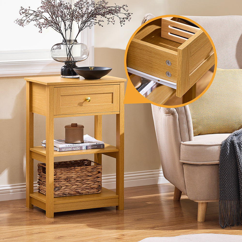 Cette élégante table d'appoint est conçue avec un tiroir et deux étagères, ce qui la rend polyvalente dans n'importe quelle pièce. Sa taille compacte la rend idéale pour les petites et grandes pièces, telles que la chambre à coucher, le salon, la cuisine ou le bureau.