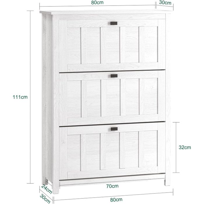 sobuy meuble à chaussures fsr162-w ce magnifique meuble universel au look vintage attire l'attention dans votre pièce et offre beaucoup d'espace de rangement.Les 3 volets vous permettent de ranger plusieurs de vos chaussures préférées. La hauteur des compartiments à chaussures peut être réglée à l'aide de tablettes amovibles, laissant ainsi de la place pour les chaussures plus grandes. la plaque supérieure peut également être utilisée comme espace de rangement. placez quelques fleurs ou un cadre photo et créezëer une atmosphère de bien-être. Vous pouvez également combiner ce meuble à chaussures avec le banc (fsr161-w). caractéristiques : - matériaux : mdf(e1), pb(e1). - dimensions du meuble : l80 x d30 x h111 cm. - poids à l'expédition : 28,7 kg. - capacité maximale : 26 kg. - facile à monter soi-même. Grâce aux instructions de montage illustrées et aux pièces numérotées, le montage est facile. facture fournie.