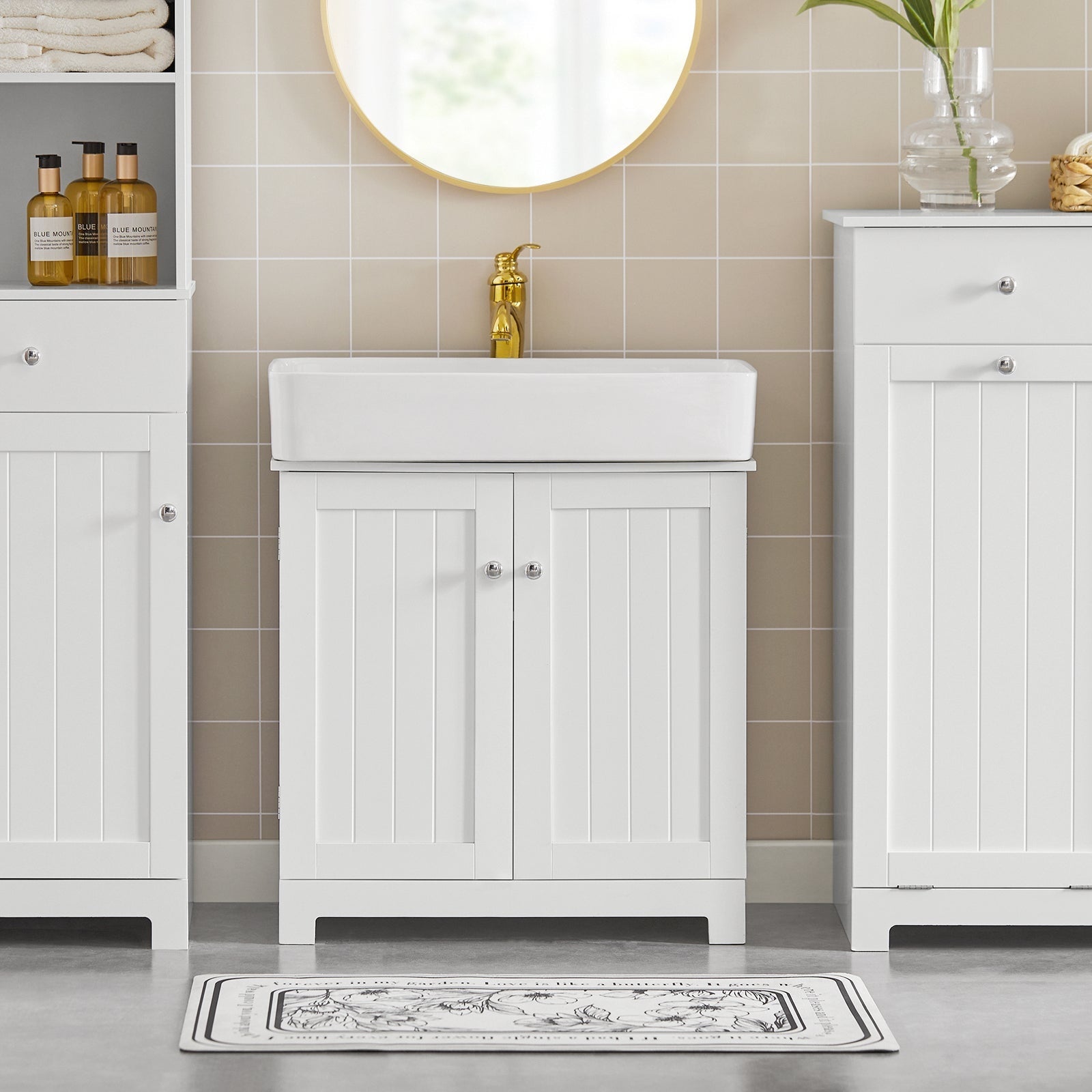 - Également en vente en tant qu'ensemble de 5 pièces : miroir de salle de bains (BZR16-W), armoire haute (BZR17-W), meuble pour lavabo (BZR18-W), étagère murale (BZR19-W), armoire de salle de bains (BZR20-W) et coffre à linge (BZR21-W).