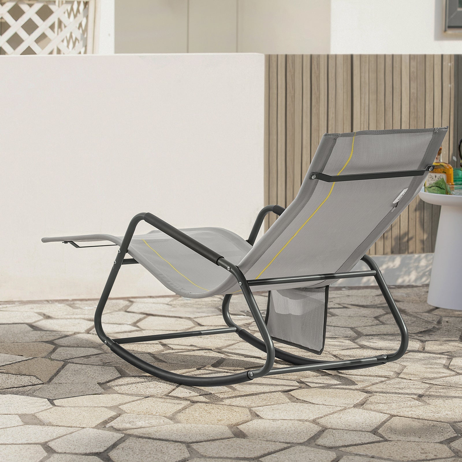 Ce fauteuil à bascule allie confort et fonctionnalité, idéal pour l'intérieur comme pour l'extérieur. Avec sa surface inclinable de forme ergonomique et son tissu confortable en fibres synthétiques, ce fauteuil offre un endroit idéal pour se détendre dans le jardin, sur la terrasse ou même à l'intérieur. Le cadre est recouvert de housses en caoutchouc qui servent d'accoudoirs confortables, tandis qu'un compartiment spécial pour le rangement de petits objets ajoute à la commodité de l'ensemble. Ce rocking-chair durable peut supporter jusqu'à 120 kg et offre un soutien stable pendant le balancement, ce qui vous permet de vous détendre en toute sécurité et confortablement. Caractéristiques:La chaise à bascule peut supporter jusqu'à 120 kg et offre un soutien stable lorsqu'elle se balance.