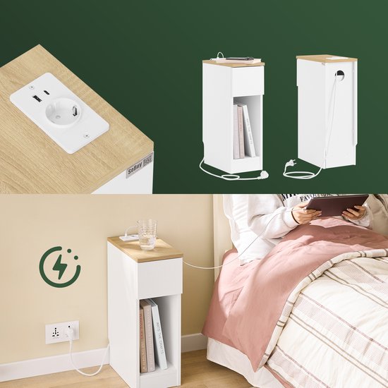 SoBuy Table de nuit mince avec station de charge, table d'appoint étroite avec prise standard, port USB et port Type-C pour chambre et salon, L20 x P35 x H60 cm, blanc, FBT111-E-WN