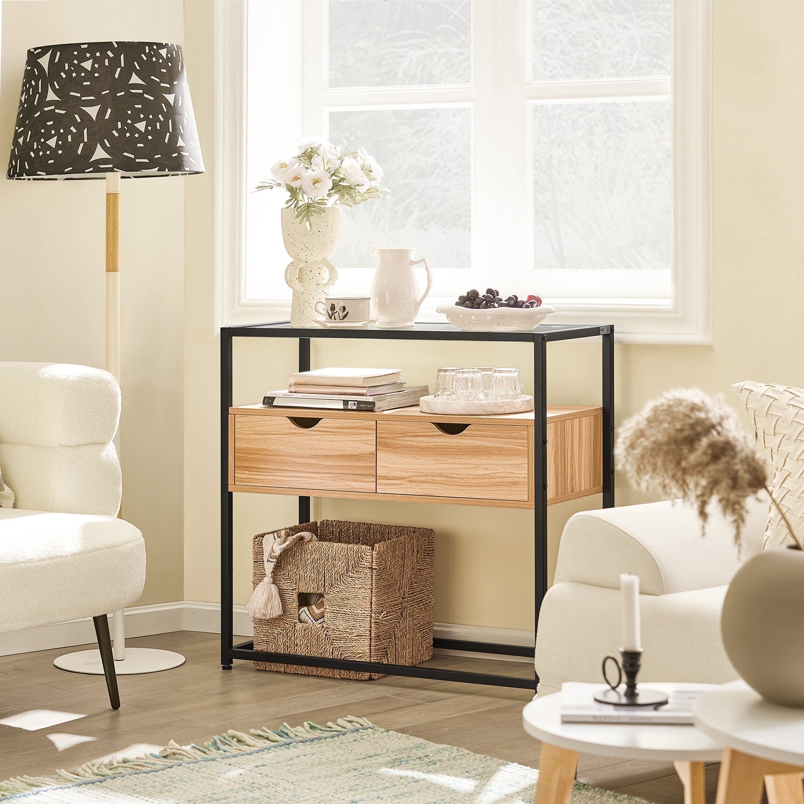 - De l'espace pour la créativité : le plateau en verre est l'endroit idéal pour exposer des photos encadrées, des plantes en pot et d'autres éléments décoratifs, tandis que le compartiment ouvert est idéal pour organiser des livres et des magazines.
