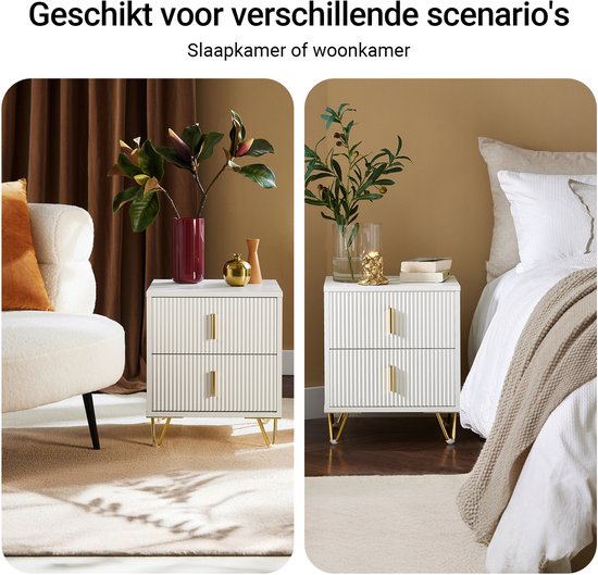 [SOUTIEN ET STABILITÉ] Fabriquée avec des pieds en métal doré, ce qui garantit que cette table d'appoint n'est pas seulement moderne, mais aussi robuste et stable. Elle est fabriquée en MDF et en panneaux de particules classés E1 et peut supporter jusqu'à 25 kg. Pas de vacillement, seulement un support fiable et solide pour une utilisation quotidienne comme table de chevet ou table d'appoint.