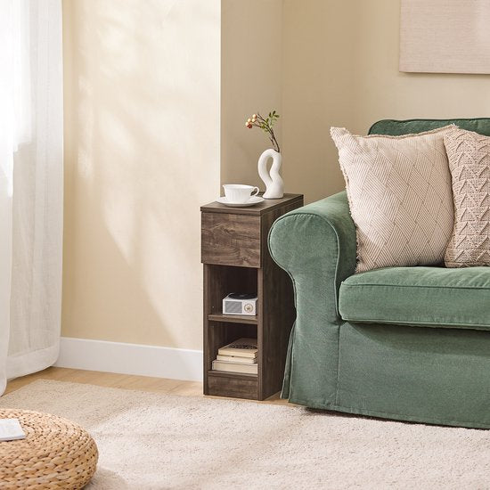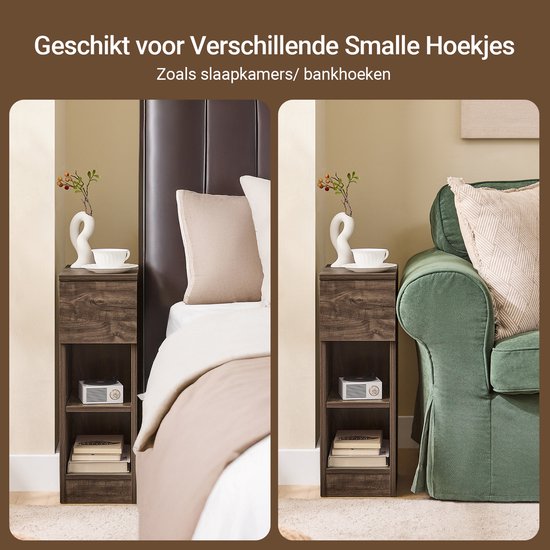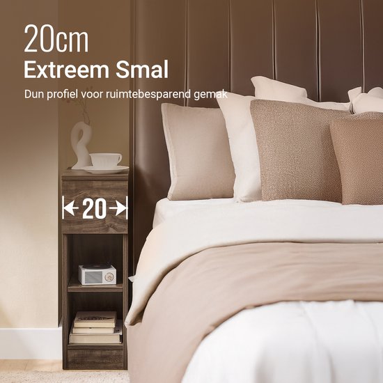 - 1 x Table de chevet - 1 x Sac d'accessoires - 1 x ManuelAvec une largeur de seulement 20 cm, cette table prend peu de place, ce qui la rend excellente pour les coins étroits et les espaces confinés.