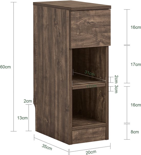 - Matériau : MDF (E1) PB (E1). - Dimensions du produit : LxPxH environ 20 x 35 x 60 cm - Dimensions de l'emballage : LxPxH environ 72 x 40 x 11 cm - Poids : environ 7,2 kg - Charge maximale : 25 kg.