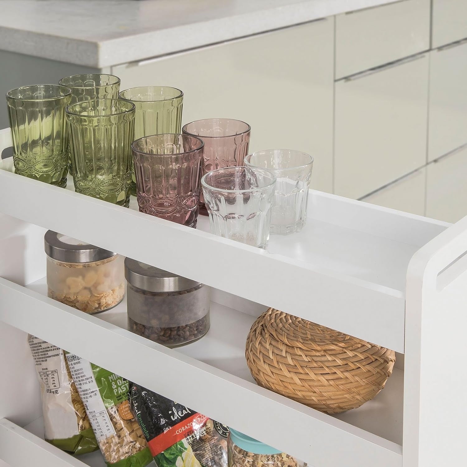 Ajoutez un rangement pratique à n'importe quelle pièce avec le chariot de niche à 4 étages. Avec son design élégant et ses fonctions pratiques, ce meuble de rangement en bois sur roulettes est un complément intelligent et polyvalent pour votre cuisine, votre salle à manger ou votre salle de bains.