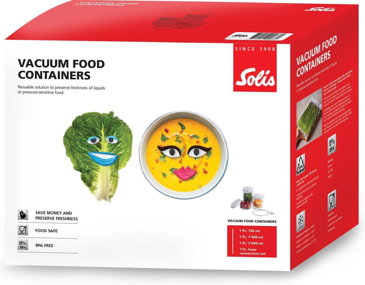 Le Solis Storage Container Vacuum est un ensemble d'accessoires composé de 3 récipients de stockage pratiques, idéaux pour un usage quotidien. Grâce à ces récipients de stockage, vous pouvez conserver les aliments frais plus longtemps.