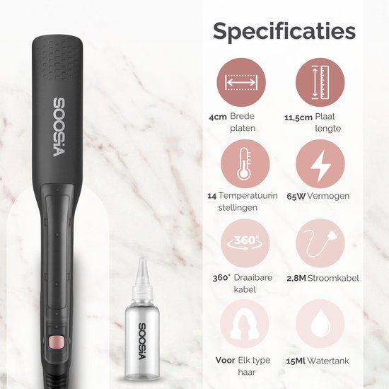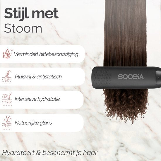 Vous voulez vous coiffer facilement sans abîmer vos cheveux ? Découvrez le Soosia SteamStyler - un lisseur et fer à boucler à vapeur 2-en-1 polyvalent qui non seulement coiffe magnifiquement vos cheveux, mais les soigne et les protège. Grâce à sa technologie vapeur innovante, ses larges plaques en céramique et ses 14 réglages de température, ce lisseur est parfait pour tous les types de cheveux, qu'ils soient fins et raides ou épais et bouclés.