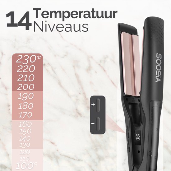 Avec 14 réglages de température entre 100°C et 230°C, vous pouvez facilement ajuster la chaleur en fonction de votre type de cheveux. La gestion intelligente de la température empêche la surchauffe et protège vos cheveux.