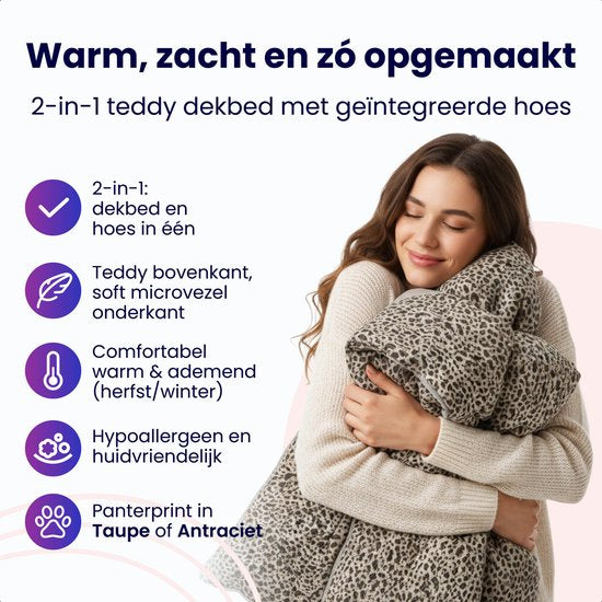 Expérimentez une commodité et un confort exceptionnels avec la Couette Teddy Panther et la housse en un de Soulsnooze. Cette couette innovante fait office de housse. Le dessus de la couette, doux et soyeux, est luxueux et chaud, tandis que le dessous, en microfibre robuste, est merveilleusement doux. Elle est lavable en machine et parfaite pour l'automne et l'hiver, que ce soit au lit ou sur le canapé. Choisissez votre couleur préférée, Taupe ou Anthracite, et rendez vos soirées instantanément plus douillettes.
