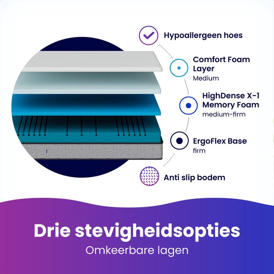 Grâce au système FlexComfort unique, vous pouvez entièrement adapter votre matelas à vos préférences. Les couches réversibles vous permettent de choisir entre un soutien moyen, moyennement ferme ou ferme. Cette polyvalence vous permet de toujours trouver l'équilibre idéal entre douceur et fermeté, quelle que soit votre façon de dormir. La structure ergonomique offre un excellent soutien et alignement de la colonne vertébrale, parfait pour les dormeurs sur le côté, le dos et le ventre.