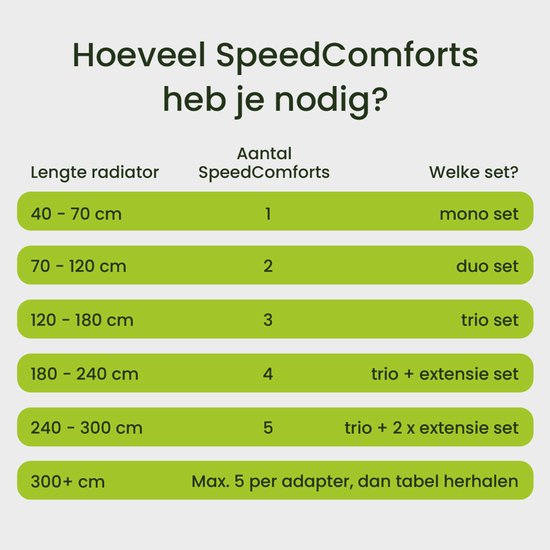 La plupart des radiateurs courants ont deux ou trois plaques (type 22 ou 33) avec un écart de plus de 7 cm. C'est là que vous placerez les SpeedComforts au bas du radiateur, ils ne seront pas visibles. Les curseurs magnétiques trouvent automatiquement les plaques de fer.