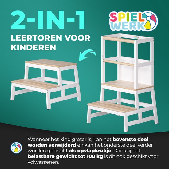 Une information utile pour les parents : des pads de protection pratiques qui peuvent être fixés à l'avant de la tour d'apprentissage, protègent la surface contre les rayures. Lorsque l'enfant grandit, la partie supérieure peut être retirée, ce qui permet à la partie inférieure de servir d'escabeau. Le tabouret convient donc également aux adultes, avec un poids chargeable de jusqu'à 100 kg.