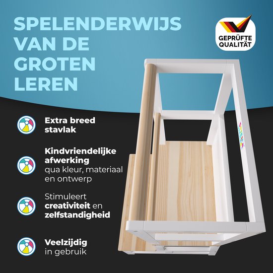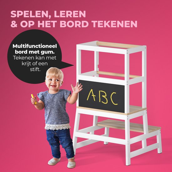 Ce meuble adapté aux enfants leur permet de se brosser les dents à l'évier ou d'aider papa à son établi en toute autonomie. Si vous souhaitez impliquer votre petit chéri dans les tâches quotidiennes et promouvoir sa créativité et son indépendance, cette tour de jeu fabriquée à 100 % en pin fiable et durable est exactement ce que vous recherchez. Un tableau à l'avant de la tour d'apprentissage offre un espace de créativité. D'un côté, les enfants peuvent dessiner librement avec des crayons, tandis que l'autre côté convient à un Stick. La gomme à effacer en bois incluse laisse de la place pour de nouveaux dessins créatifs.