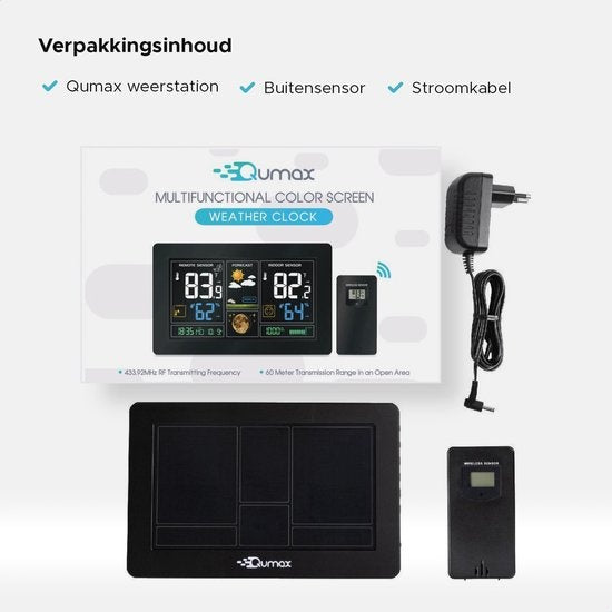 La station météorologique de Qumax est un excellent complément à votre maison. En un coup d'œil, vous pouvez voir l'heure, le jour, la date, la température intérieure et extérieure, l'humidité intérieure et extérieure et la position de la lune. Grâce aux graphiques, il est facile de connaître les prévisions pour aujourd'hui. La station météorologique tout-en-un de Qumax dispose d'une fonction d'alarme et se met automatiquement en mode veille. Le capteur extérieur a une portée de 60 mètres et est entièrement étanche.