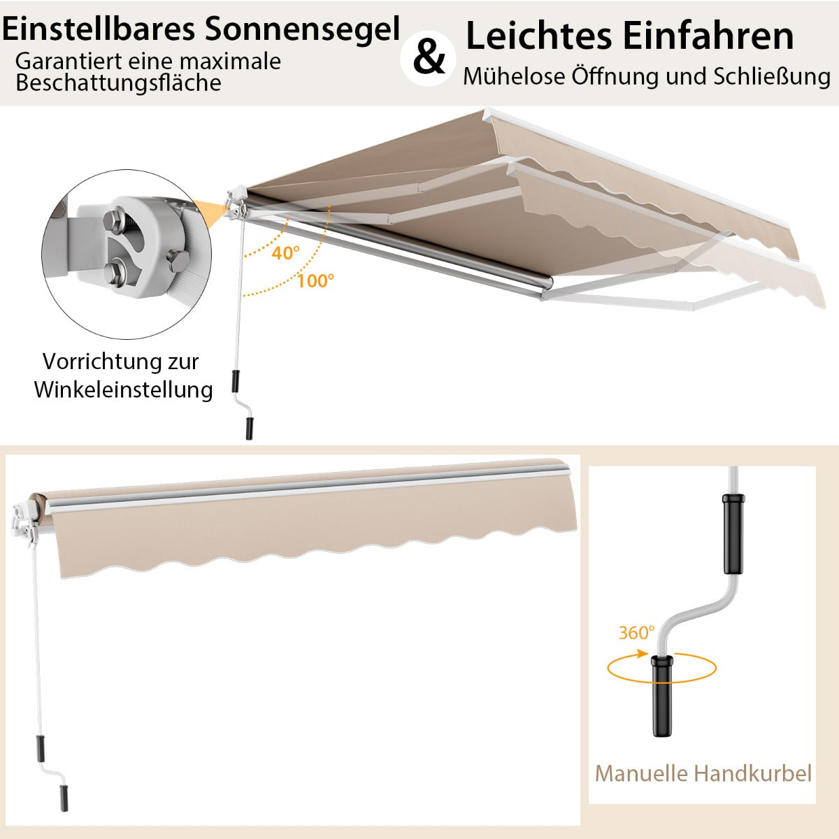 Facile à rétracter: cet auvent est équipé d'une manivelle manuelle de 1,5 m facile à utiliser. En tournant la manivelle, l'auvent peut être facilement fermé et ouvert. Cela permet d'économiser de l'énergie et d'assurer la sécurité car vous n'avez pas besoin de monter quelque part.La manivelle manuelle de 1,5 m est facile à utiliser.