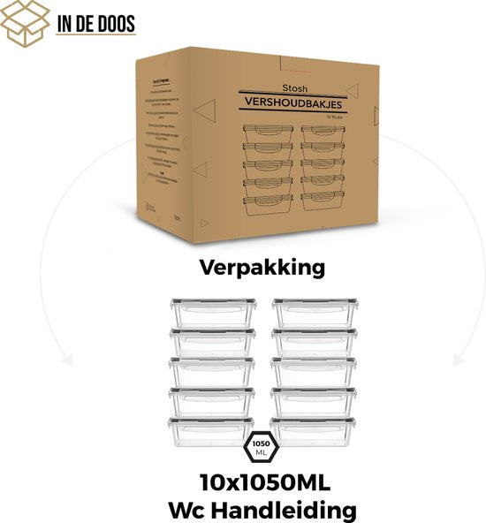 Vous êtes à la recherche de contenants durables pour aliments frais ? Alors, jetez un coup d'œil aux boîtes de conservation pour aliments frais de Stosh. Stosh vous permet de conserver tous vos aliments à la fois à l'abri des fuites et de l'air. Les aliments restent ainsi frais deux fois plus longtemps. L'ensemble comprend 10 contenants de 1050 ml, la taille idéale pour le déjeuner, le dîner ou les restes.Réutilisable. Se glisse dans n'importe quel sac à lunch ou sac à dos standard, pour que vous ayez toujours des aliments frais et sains avec vous. Sans BPA. Facile à nettoyer et ne laisse aucun goût ou odeur dans votre nourriture.