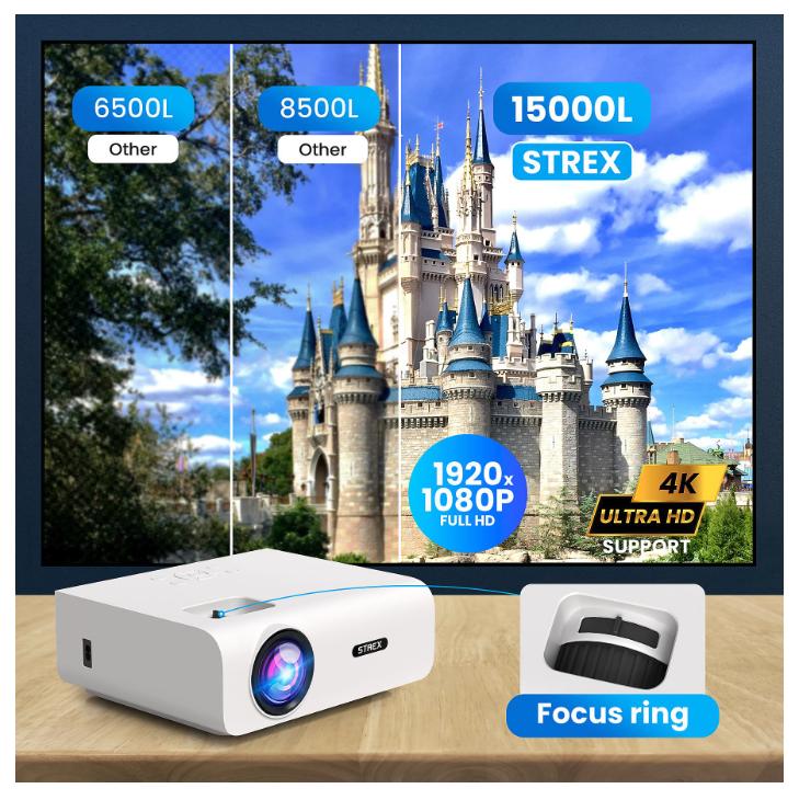 Strex - Mini vidéoprojecteur - 1080P Full HD - 15000 lumens - Streaming sans fil - WiFi - Bluetooth - Blanc