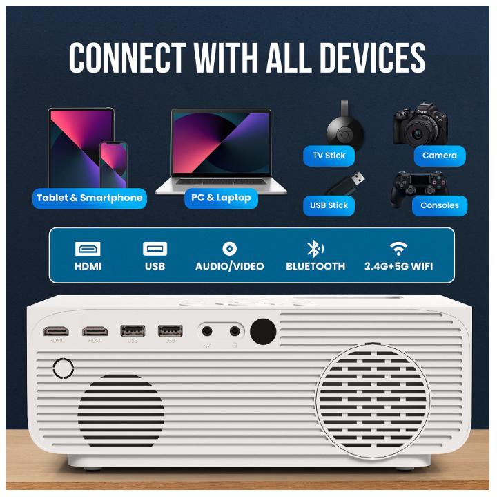 Ce grand projecteur 1080P de Strex est compatible avec de nombreux appareils. Grâce au WiFi et au Bluetooth 5.0, mais aussi parce qu'il dispose de 2 ports HDMI, de 2 ports USB, d'un port AV et d'un connecteur jack 3,5 mm. Cela signifie que vous pouvez facilement connecter votre casque, vos écouteurs (sans fil), votre smartphone, votre tablette, votre ordinateur portable, votre console de jeu, vos clés USB et d'autres appareils. Idéal pour les jeux, les soirées cinéma, les présentations et bien plus encore ! Spécifications du produit
