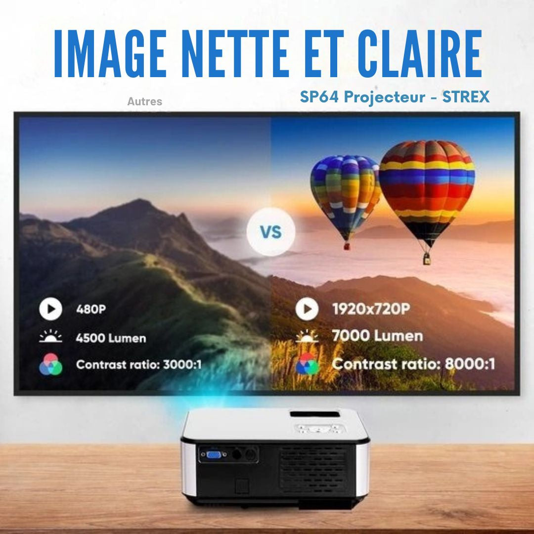 Le projecteur Strex HD est conçu pour offrir une expérience cinéma accessible à domicile. Malgré son format compact, il délivre une image lumineuse grâce à une puissance de 7000 lumens et prend en charge les contenus jusqu’en Full HD 1920 x 1080P.