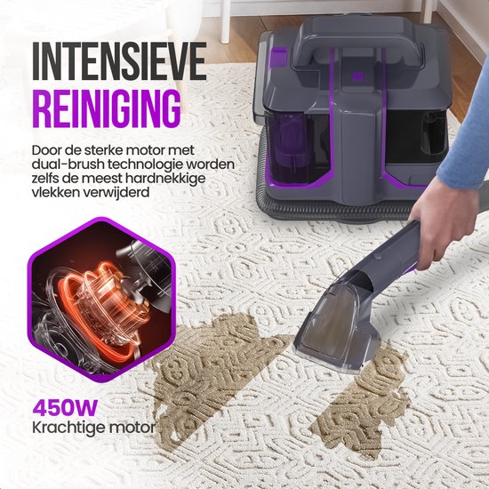 Ce nettoyeur de taches de Strex est équipé d'un puissant moteur de 450W. Comme vous pouvez l'imaginer, cela garantit également une puissance d'aspiration impressionnante de 11 000 kPa. Les taches les plus tenaces sont ainsi éliminées en un tournemain.