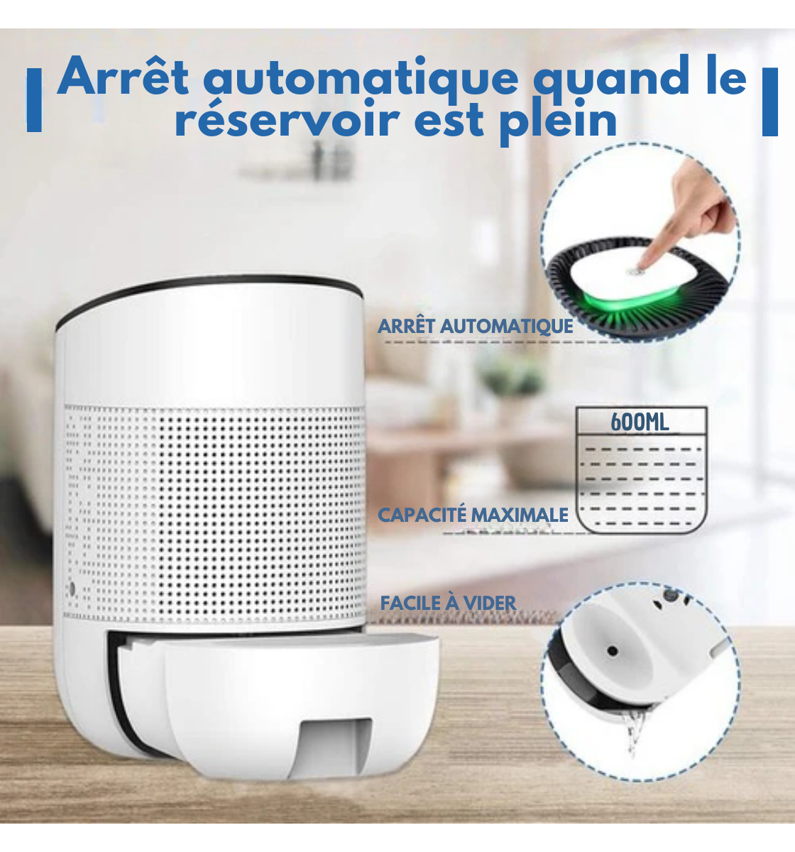 Le déshumidificateur Strex dispose d'un réservoir d'eau spacieux de 600 ml, ce qui vous évite de devoir vider constamment le bac de récupération. Le réservoir est plein ? Pas de problème, l'appareil s'arrête automatiquement.
