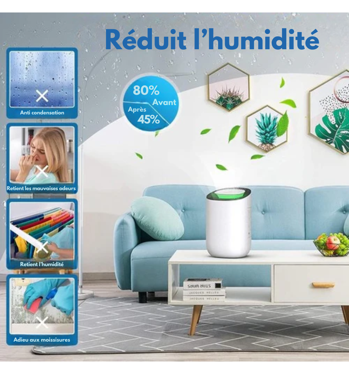 Vous voulez protéger vos meubles, lutter contre les allergènes et respirer librement ? Le déshumidificateur Strex s'attaque aux problèmes d'humidité à la source ! Cet appareil élimine sans effort l'humidité de votre intérieur et assure un environnement sain et purifié. Avec un climat intérieur optimal, les pièces moites, les endroits humides et les moisissures disparaissent comme neige au soleil pour un confort et une sensation de fraicheur.