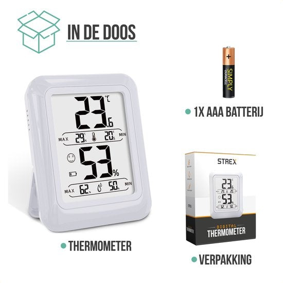 Strex Digital Thermo Hygrometer White - Thermomètre numérique d'intérieur - Hygro mètre d'intérieur - Station météo avec hygromètre - Pile incluse