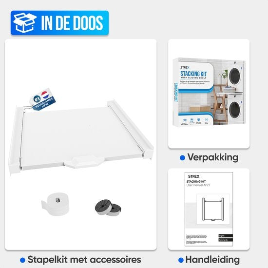 StabilitéAvec le kit de superposition Strex, vous placez votre sèche-linge au-dessus de votre lave-linge de manière stable. En utilisant une pièce intermédiaire, vous pouvez être sûr que vos appareils sont en sécurité. Placez l'adaptateur entre les machines et serrez la sangle de fixation autour des deux appareils.