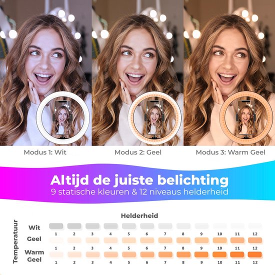Vous êtes-vous déjà demandé pourquoi les photos et les vidéos sur les médias sociaux sont toujours aussi parfaites ? Nous vous révélons le secret : la bonne lumière ! Pour créer vous-même ces photos impressionnantes, vous n'avez vraiment pas besoin d'un équipement coûteux ou de l'aide d'un professionnel : avec la lampe annulaire multicolore de Studio ME, vous pouvez utiliser votre smartphone pour créer des images professionnelles et accrocheuses qui vous assureront de nombreux likes et partages ! De plus, vous pouvez laisser libre cours à vos idées créatives, car cette lampe peut produire jusqu'à 100 couleurs différentes. Sortez du lot !