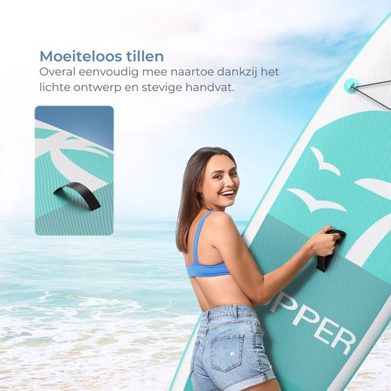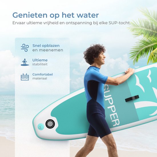 Supper Sup Board - Max. 120KG - Gonflable - Planche à pagaie - Pompe - Aileron - Leash - Sac de transport - 285 x 76 cm - Turquoise
