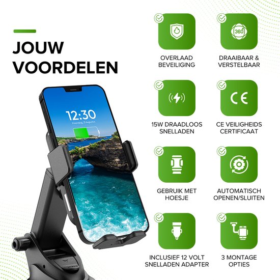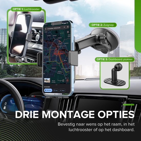 Ce support pour téléphone convient à n'importe quelle taille de téléphone et, grâce aux multiples options de fixation, ce support peut être utilisé dans n'importe quelle voiture. Le téléphone peut également être utilisé avec une coque protectrice et au bas du support de téléphone, il y a une ouverture pour un câble de recharge supplémentaire, par exemple pour utiliser Carplay.