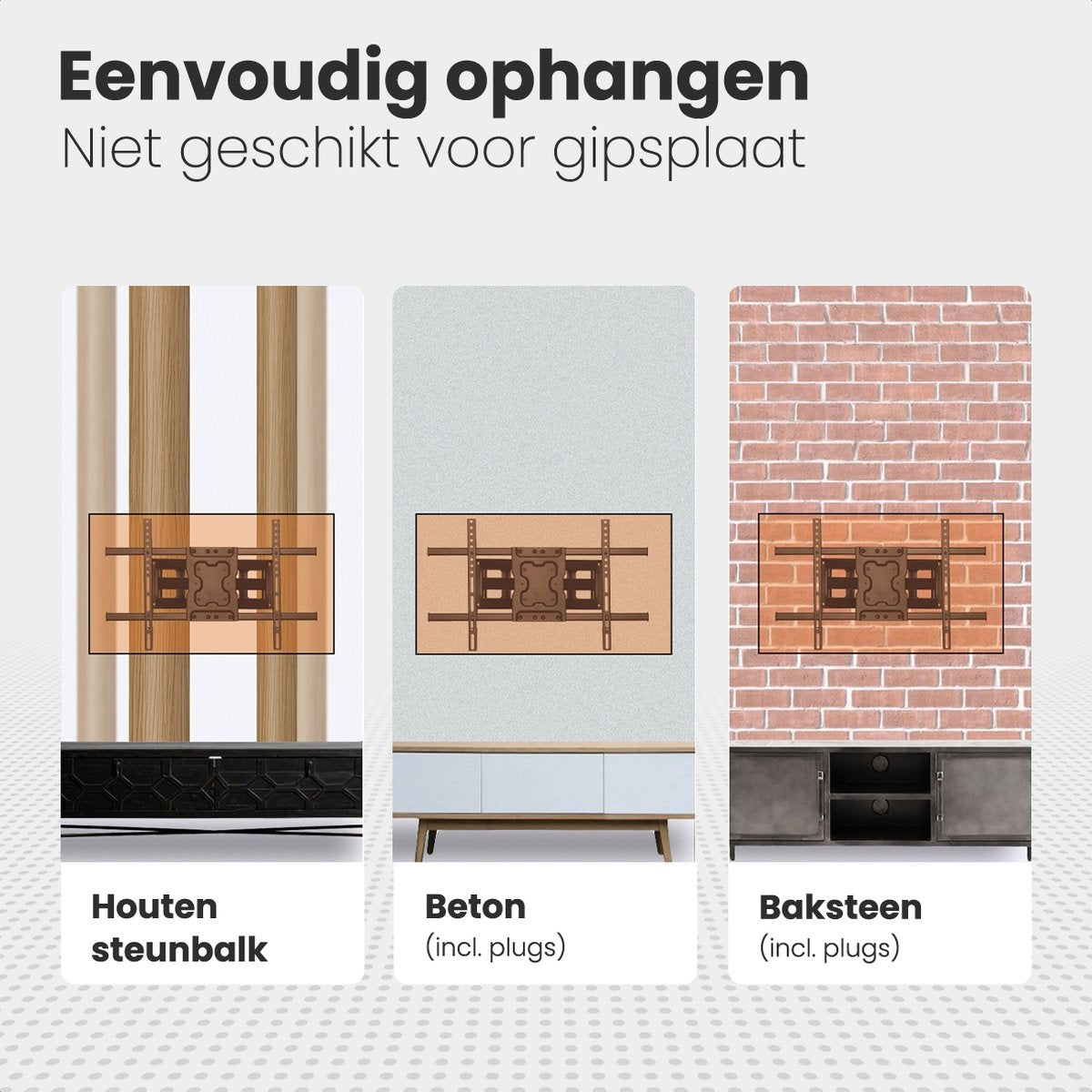 Vous pouvez fixer le support mural en toute sécurité sur un mur en béton, en brique ou en bois. Toutefois, n'accrochez jamais un support TV sur un simple mur en plâtre, car il n'est pas assez solide. Le support mural Auronic TV est livré avec un niveau à bulle et des boulons pour les différents supports muraux.