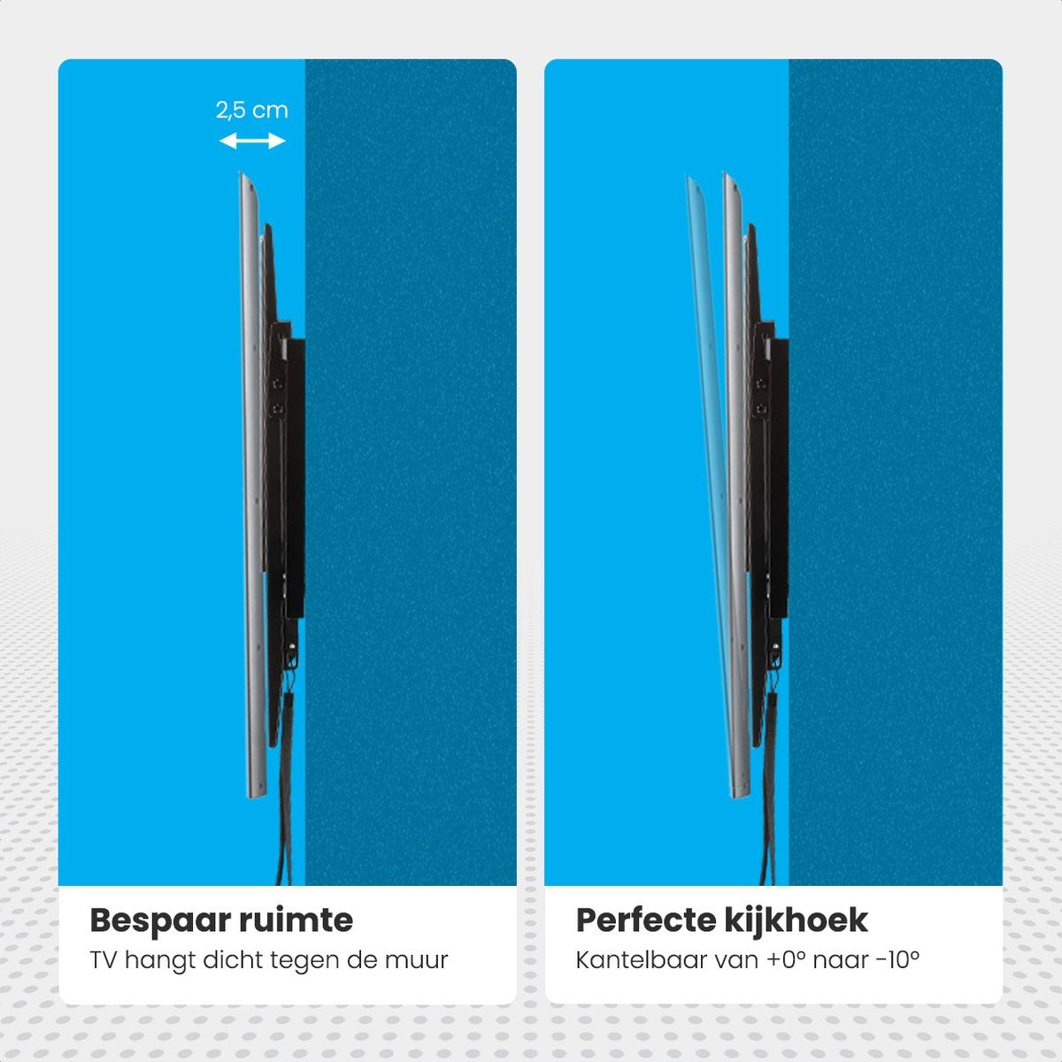 Grâce à cette conception unique à mouvement complet, vous obtiendrez l'angle de vue idéal en un rien de temps. En tant que passionné de films et/ou de séries, vous savez mieux que quiconque à quel point l'angle de vue idéal influe sur votre expérience et votre plaisir. Avec un angle d'inclinaison allant jusqu'à 10°, vous pouvez profiter au mieux de votre film ou de votre programme préféré dans tous les coins de la maison.