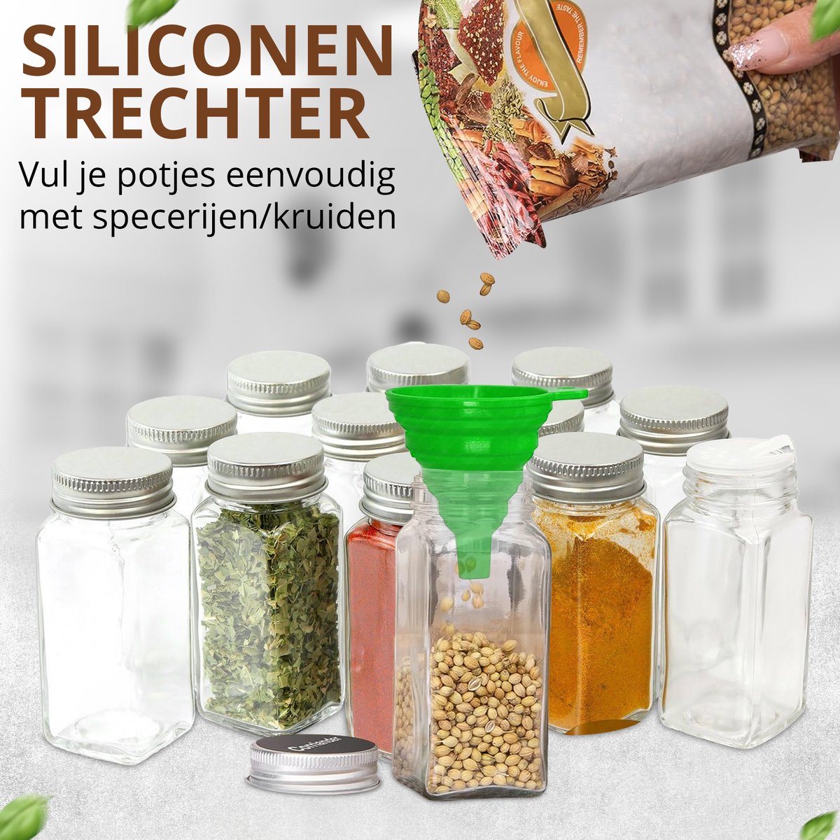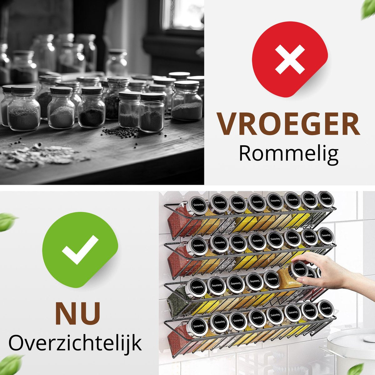 .L'ensemble comprend tout ce dont vous avez besoin pour organiser vos épices de manière ordonnée. L'entonnoir inclus facilite le remplissage des pots, tandis que la brosse de nettoyage assure un entretien hygiénique. Grâce aux nombreuses étiquettes en néerlandais et en anglais, ainsi qu'aux étiquettes vierges munies d'un marqueur, vous trouverez toujours rapidement la bonne herbe.