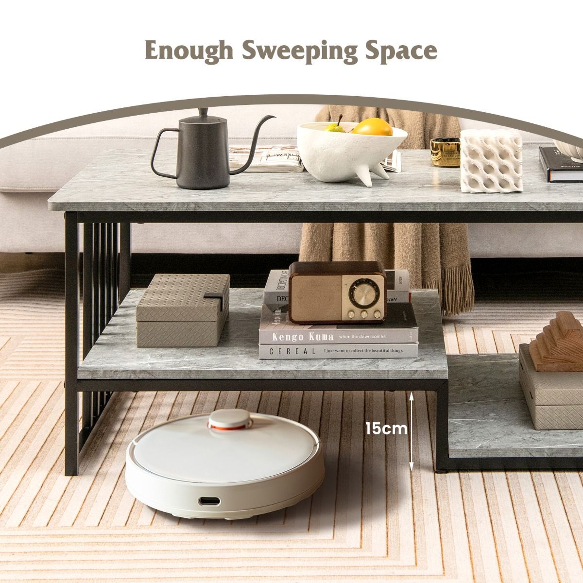 Détails élégants: Le motif orné en faux marbre a été sélectionné pour apporter une esthétique chic et subtile. Avec sa structure en métal laqué noir, cette élégante table basse sera du plus bel effet dans différents styles de pièces tels que le salon, la chambre à coucher et l'espace de réception. Très grand espace de rangement: La table centrale est dotée d'un plateau spacieux, d'une étagère supérieure ouverte et d'une étagère inférieure qui augmentent l'espace de rangement et d'exposition pour les articles essentiels tels que les magazines, les tasses et les verres. Structure solide et stable: La combinaison d'un cadre métallique robuste et d'un plateau épais crée une table basse solidement construite avec une capacité de charge élevée. De plus, les repose-pieds réglables assurent la stabilité de la table basse sur les sols irréguliers et protègent le sol contre les rayures.La table basse est équipée d'un repose-pieds réglable en hauteur.