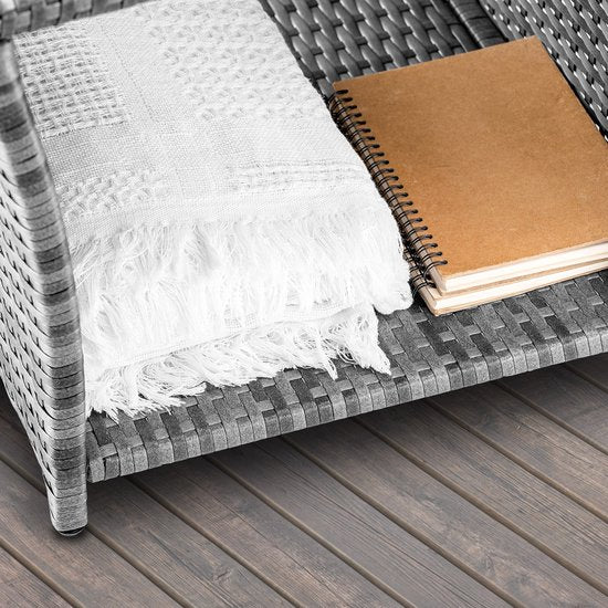 La table d'appoint pratique en polyrattan de CASARIA® est le complément idéal de votre intérieur. Comme option de rangement près d'une chaise longue ou d'un coin salon, comme repose-pieds ou comme support à plantes, elle est toujours un point fort. Grâce à son design élégant, la table idéalement peut être combinée. Le plateau WPC résistant et extrêmement résistant aux intempéries se compose d'un mélange de fibres de bois et de plastique et convainc par son aspect bois naturel. Vous pouvez donc utiliser la table basse aussi bien à l'intérieur qu'à l'extérieur. Sous la table se trouve un compartiment de rangement où magazines, livres et autres objets utiles trouveront leur place. Le polyrattan de la table est résistant aux intempéries, à la saleté et aux rayons UV. La structure de la table est en acier peint par poudrage, ce qui la rend particulièrement durable, stable et robuste. Le plateau de la table peut supporter une charge totale de 80 kg.