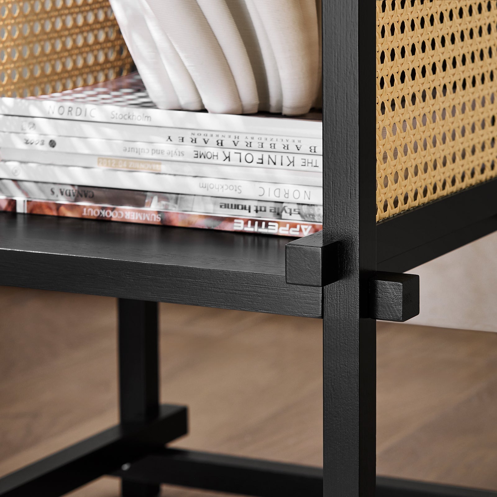 - Couleur : noir avec accent en rotin jaune