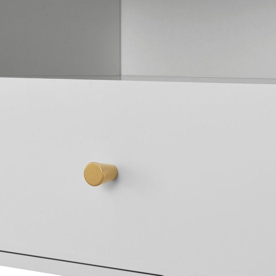 La table de nuit contemporaine pour enfants Jamie, finie en blanc et dotée d'un tiroir, d'une étagère et d'un compartiment ouvert, est le compagnon idéal pour des nuits de rêve ! Avec sa jolie poignée dorée et son look sophistiqué à la finition brillante, elle est non seulement un bel ajout à la chambre d'enfant, mais aussi très fonctionnelle. Elle est facile à entretenir et se nettoie sans effort avec un chiffon humide. Cette armoire compacte en bois et en métal offre beaucoup d'espace pour les objets importants. Grâce à sa faible hauteur, elle est également parfaite pour les jeunes enfants.