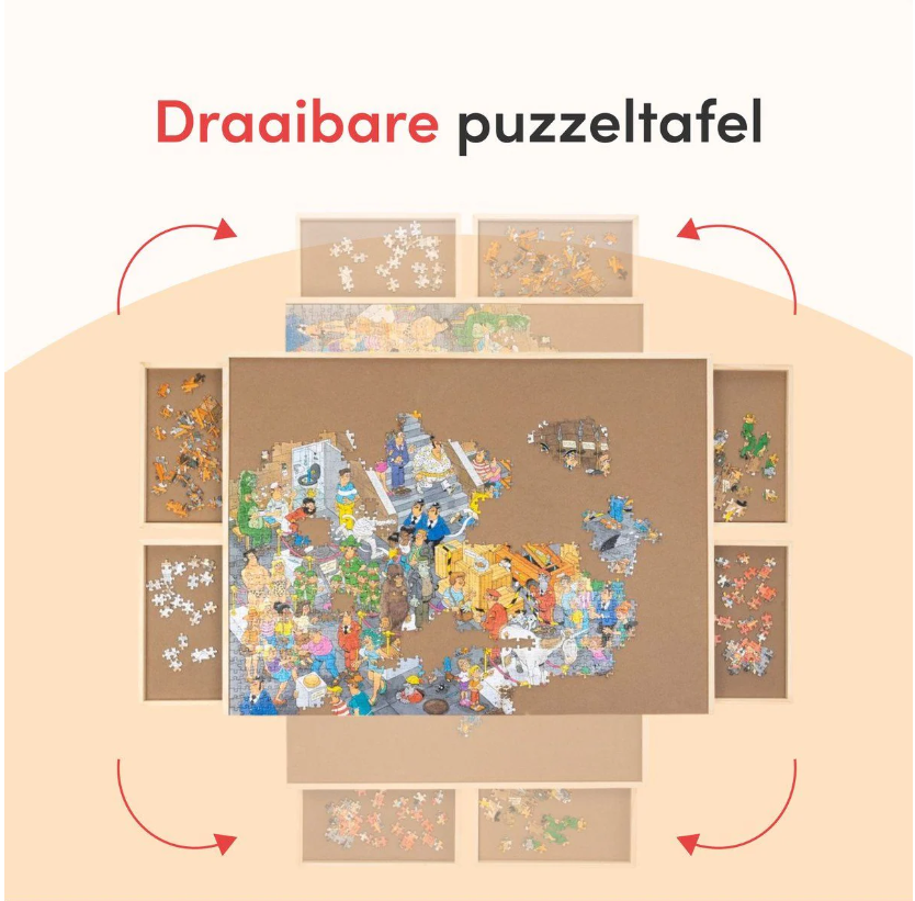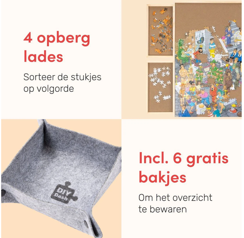 Les quatre tiroirs de rangement vous permettent de trier facilement et de garder vos pièces de puzzle organisées. Il est ainsi très facile de trouver rapidement la bonne pièce et de continuer à jouer sans interruption. Les tiroirs sont facilement amovibles et peuvent être gardés à portée de main pendant que vous jouez au puzzle, de sorte que votre poste de travail reste toujours propre et dégagé.