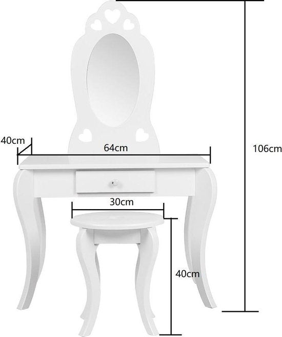 Une belle et élégante coiffeuse avec des cœurs, idéale pour la chambre des filles dans la couleur blanche. Avec un look brocante classique et une finition propre, cette table s'intégrera parfaitement dans une chambre de fille ou dans d'autres pièces de votre maison. Cette coiffeuse à cœurs blancs plaira à coup sûr à votre petite princesse et pourra être utilisée à diverses fins, par exemple pour jouer à la coiffeuse, à la maquilleuse ou à la prothésiste ongulaire. Elle est également idéale pour les travaux manuels ou comme bureau. Cette table blanche avec miroir est dotée d'un tiroir compact pour ranger soigneusement le maquillage, les accessoires et les bijoux. Le tabouret en bois robuste complète l'ensemble. IMPORTANT : Les dimensions de la table de maquillage sont les suivantes : hauteur 106 cm, largeur 64 cm et profondeur 40 cm. Dimensions du tabouret : hauteur 40 cm et largeur 30 cm. Inclut les instructions de montage et le matériel nécessaire à l'assemblage.